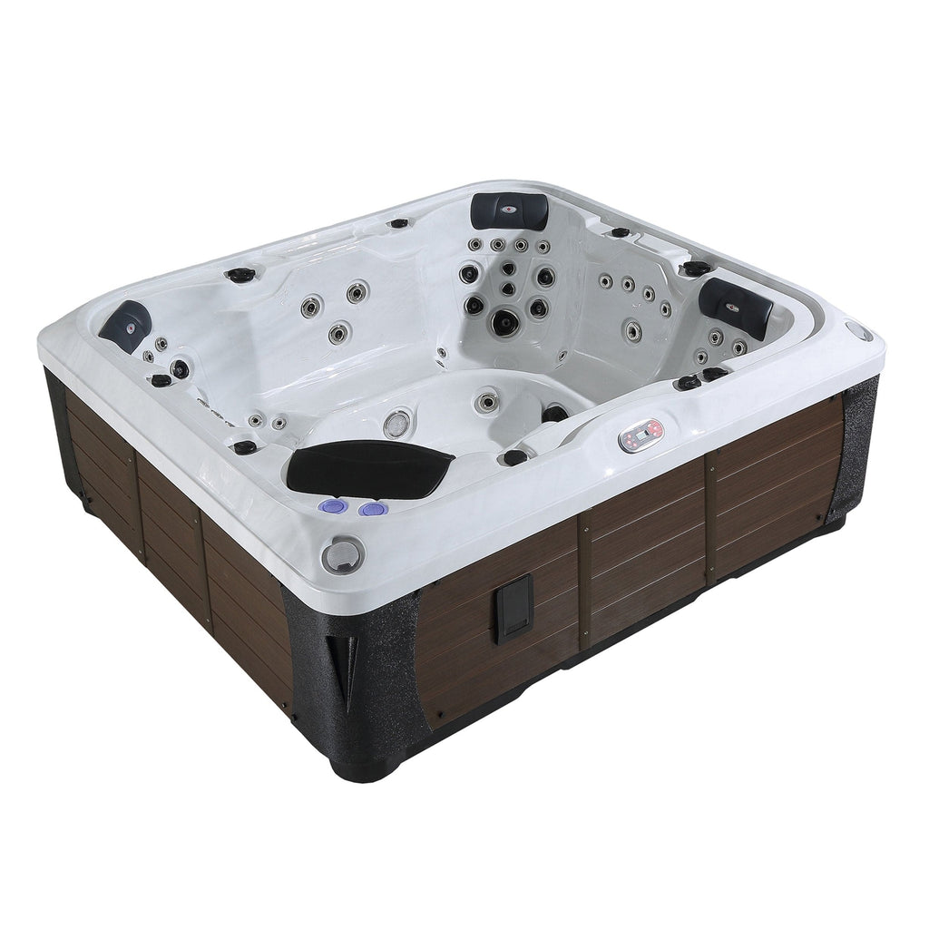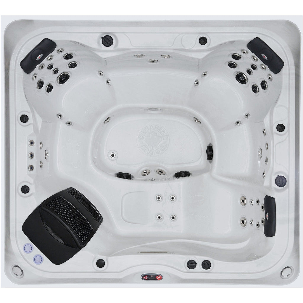 All Canadian Spa Company Spas provide an unbeatable combination of great service, high-end features, and design which are sure to satisfy any household. Our spas come with valuable customer and technical support for the lifetime of the spa. We use American made components, including Waterway, Balboa, and Lucite Acrylic.Specifications Electrical 240 V / 50 A Weight 950 lbs (Dry), 3900 lbs (Filled) Water Capacity 1350 L Jet Count 55 Seat Count 6 Size 95 x 85 x 37 in (240 X 216 x 94 cm) Pump 2 x 2 Speed 5 HP (16.4A) Heater 5.5 kW Included 5"/3" hardtop cover, Glacier Antimicrobial filter set, and curbside delivery
