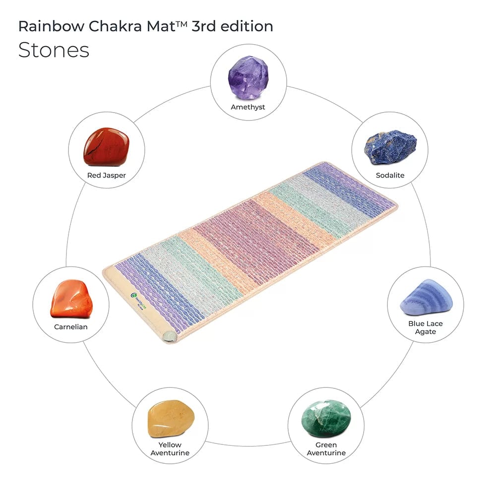 The Rainbow Chakra Mat is uniquely designed unlike any other model to enrich and enhance spiritual energy through the use of natural therapies and facilitates essential processes needed to achieve spiritual enlightenment. The surface of the mat consists of pounds of 7 different natural gemstones. These gemstones become a heated surface to lie on that works to release tension all throughout your body. This maximizes your comfort and focus. Complete relaxation is vital to establishing a connection with your spiritual energy. Additionally, the heat of the Rainbow Chakra Mat will assist with detoxification and cleansing of the body through excessive sweating.