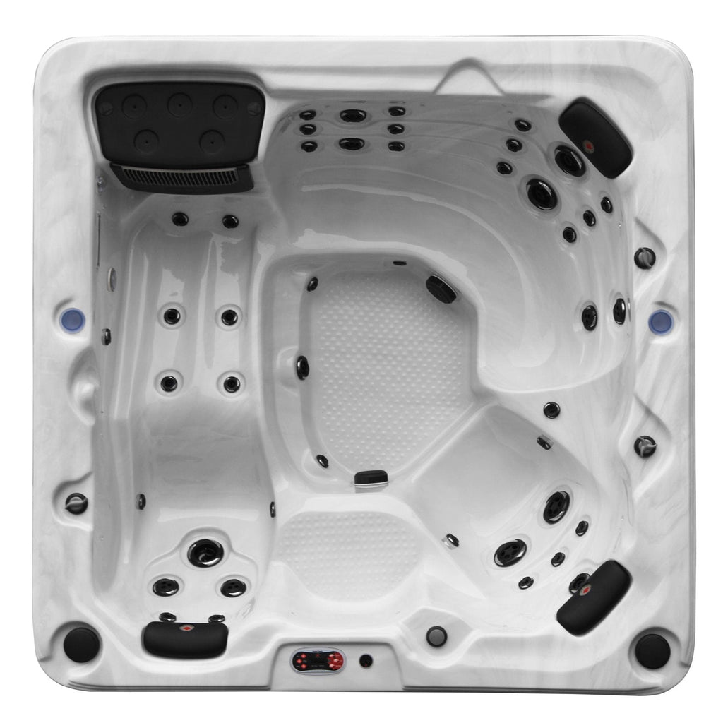 Specifications Electrical 240V/50A Weight 900 lbs (Dry), 3350 lbs (Filled) Water Capacity 1110 L Jet Count 44 Seat Count 6 Size 84 x 84 x 32 in (214 x 214 x 82 cm) Pump 2 x 2 Speed 5 HP Heater 5.5 kW Included 5"/3" hardtop cover, Antimicrobial Glacier filters, and curbside delivery